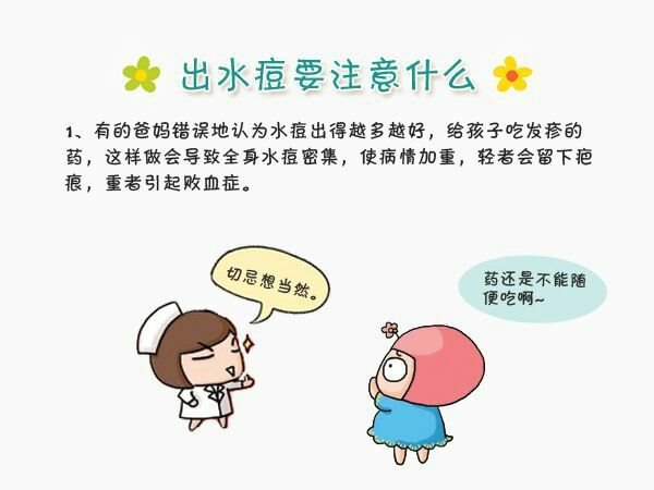 1、 水痘因为是病毒感染,所以一般抗生素无效。可用中药涂抹患处,或者口服。需注意,这种疾病会发痒,病情发展成水泡时,尤其巨痒难忍,小心别手抓挠痒,抓破了里面的脓性液体感染更快,并且这时候有可能留下疤痕,像天花留下的麻坑一样的,对容貌和肌肤影响巨大。
