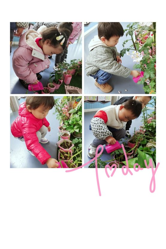 看,我们正在给蔬菜宝宝浇水,每天给植物松土、浇水、施肥并记录它们的成长过程,这可是一件非常有意义的事情呢!