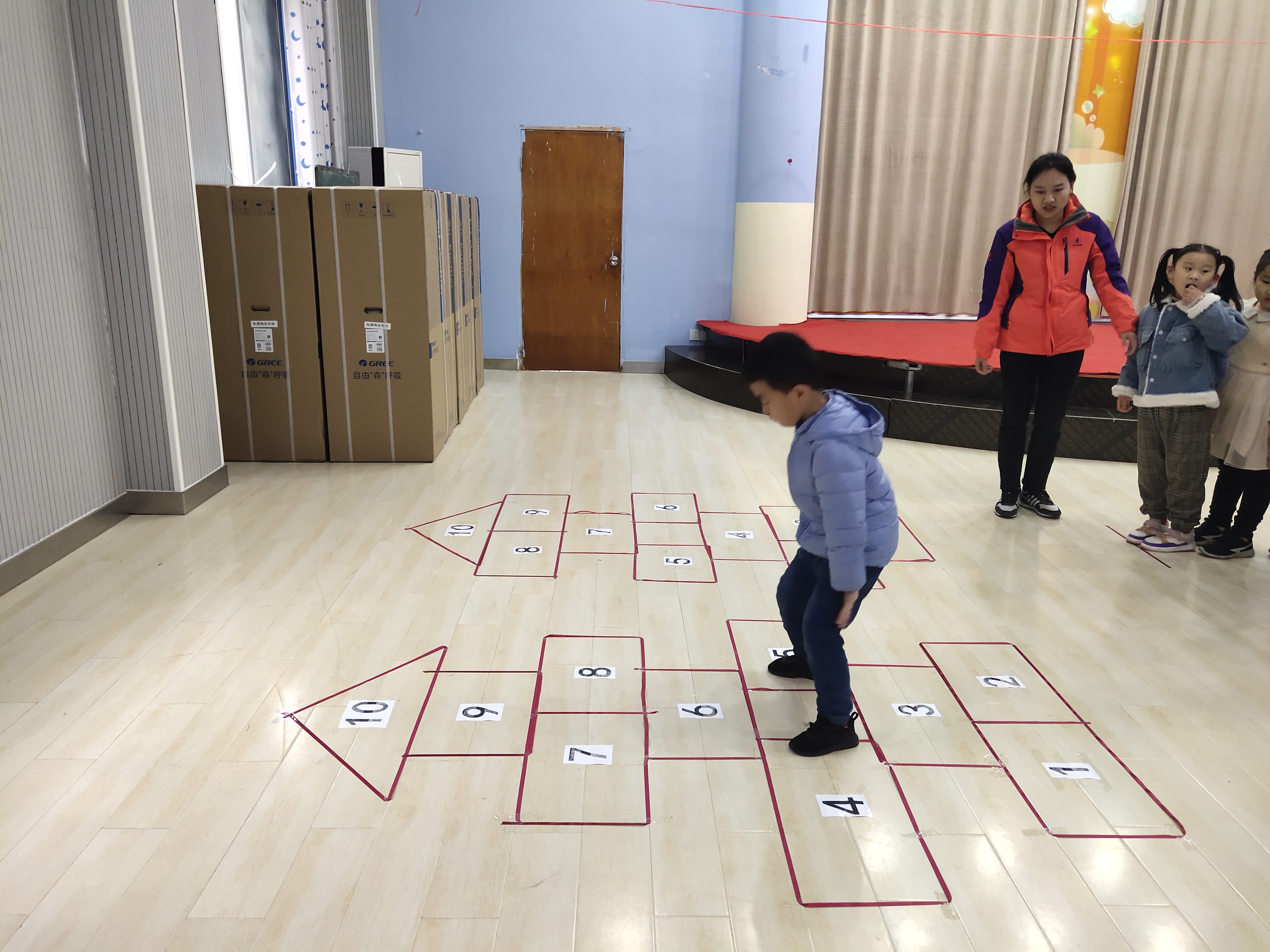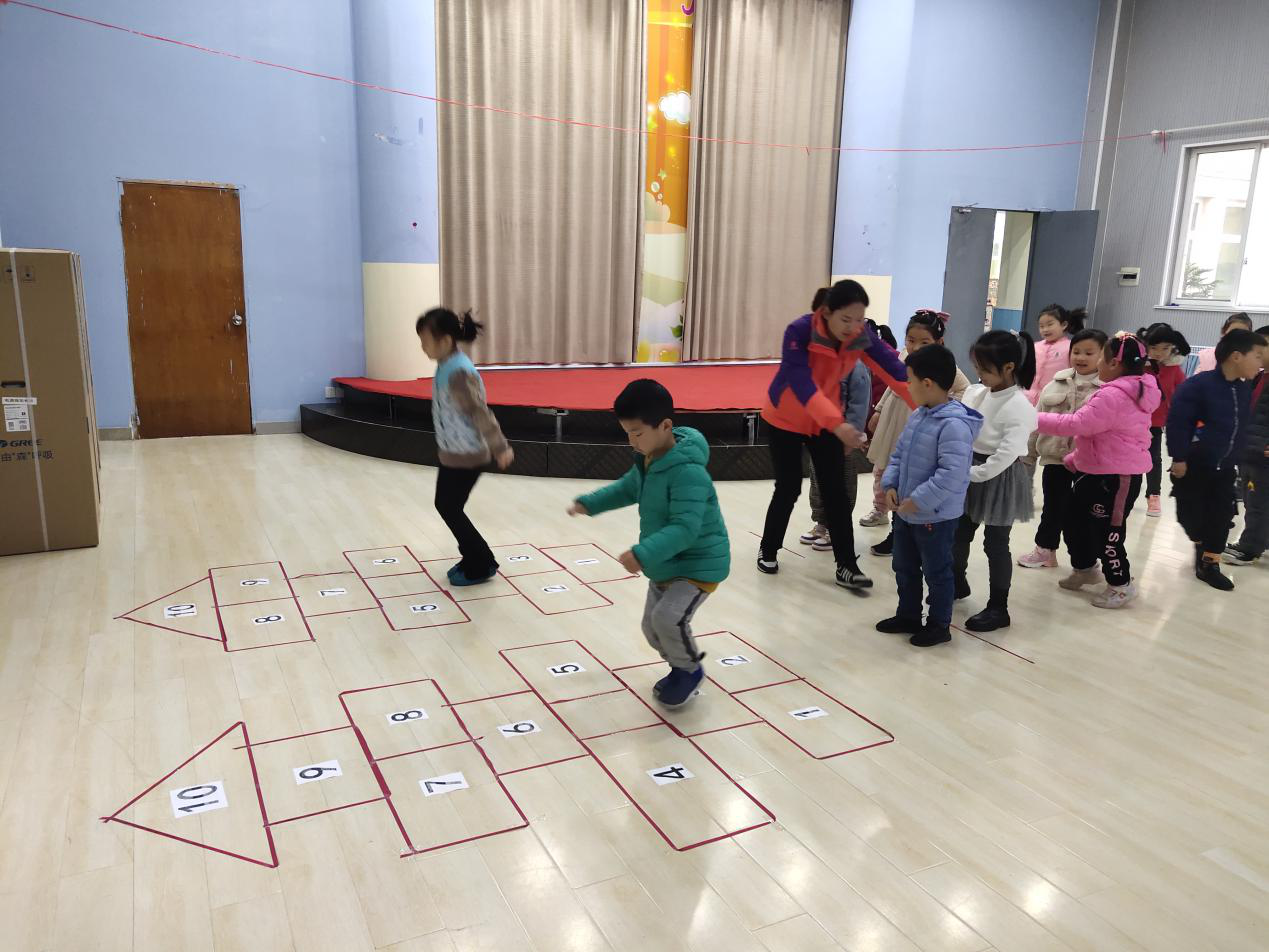 跳房子,是中国民间传统的体育游戏之一,趣味性、娱乐性极强,曾深受广大儿童的喜爱。它不仅能提高儿童跳跃、奔跑和保持身体平衡的能力,还能培养他们团结、协作和锻炼身体的意识。所以,2020年11月26号,鲁莉莉老师就以《跳房子》这个民间游戏组织了一节教学活动。