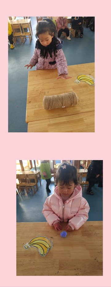 琪琪高兴地叫了起来,“我找到了,我找到了!”兴奋之余,她又思考了一会儿,然后把麻绳在桌子上滚起来。小欣也找来了毛球滚动玩了起来!