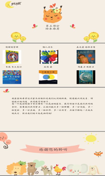 最后家园合作方面,介绍家长助教、家长约谈并推荐绘本及教育书籍。