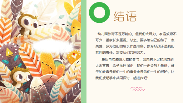 我们的目的是为了让家长了解幼儿园的教育不是万能的,但幼儿园会尽力帮助每一个孩子,相比于幼儿园教育,家庭教育也不少。要多给孩子一点关爱,多为他们的成长做一些准备。每一个成功的孩子背后都有一个成功努力的家长。教育孩子是我们共同的责任。