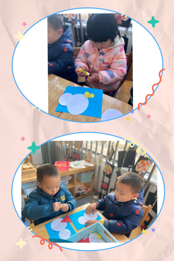 在美术区游戏时间里幼儿动手动脑,大胆创作,雪人粘贴画让寒冷的冬日有了无限的诗意和美好。宝贝们收获了成果,体验了自己操作的过程,收获了成功的喜悦!