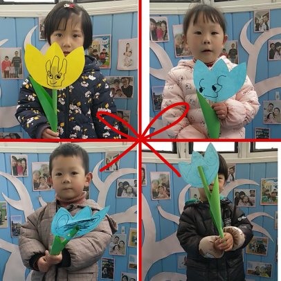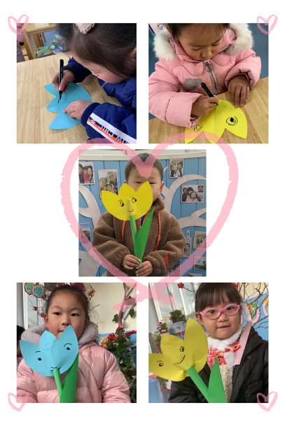看,小朋友们正在用彩色的花朵纸画一张张可爱的笑脸,再粘贴成一个大大的花朵,寓意送给妈妈奶奶、外婆们的“礼物”。
