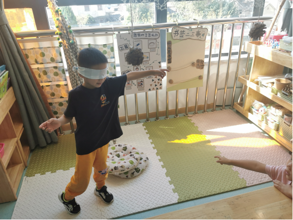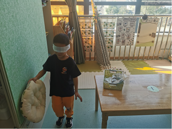 当我被蒙上眼睛,心里就害怕,走路会用手和脚慢慢的摸。