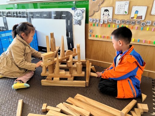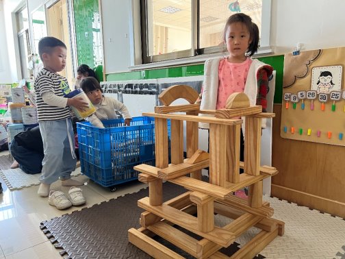 同样吸引孩子们的还有建构区,中班孩子的建构水平相对于小班时来说有着“质”的提高。他们可以在引导下自己去探索不同建筑物的建构技巧,同时还会一起合作完成建构的作品。