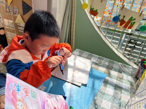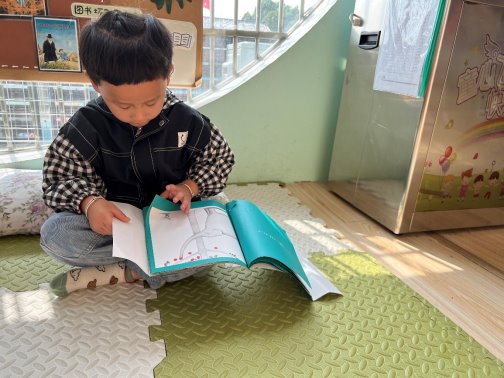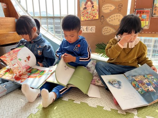 在讨论激烈的其他几个区角的环境下,图书角会显得格外的安静,每个孩子都会用心地阅读手中的绘本,利用户外游戏时间,将自己的故事和其他小朋友分享。