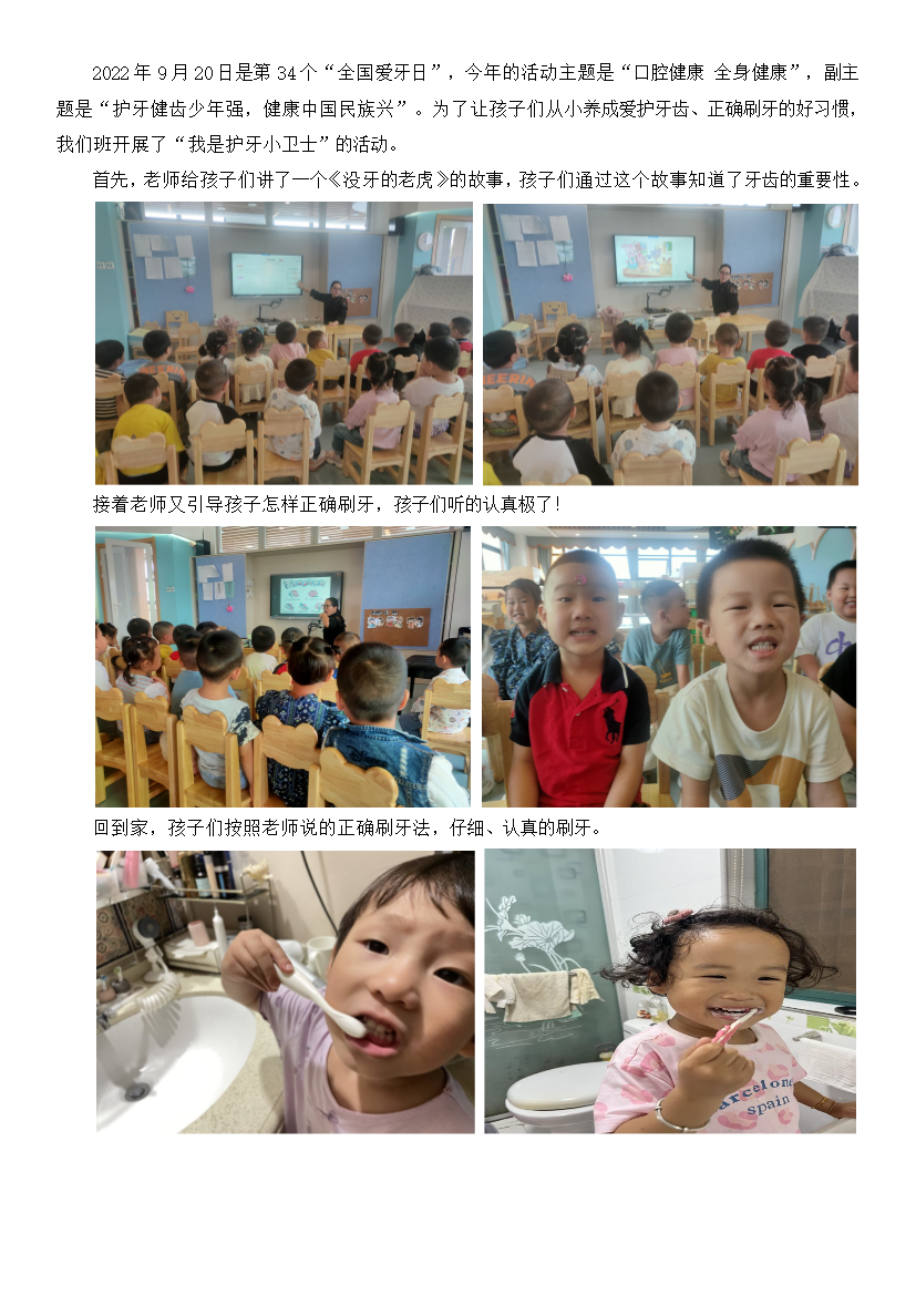 口腔保健是人类文明的象征,每个人都希望自己又一口洁白、整齐的牙齿,而关键在于从小打好根底。通过本次活动,相信我班幼儿都会用正确的方法来保护牙齿,并拥有一口健康、漂亮的牙齿!