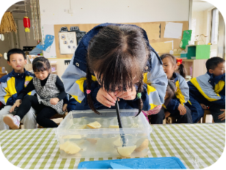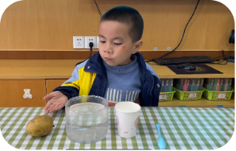 那土豆生活在哪里呢?我们开始了土豆的种植实验。我们分成了三组,水培组、土培组和空气培组。孩子们根据自己的实验猜想加入不同的小组。经过一段时间的观察,孩子们发现土豆在土里、水里、空气中都发芽了,芽越来越长了。在土里的土豆长得最快,然后是水里的,空气里的土豆虽然发芽了,但是长得最慢,还是发芽的状态。目前实验仍在继续之中。