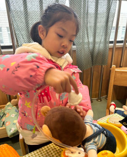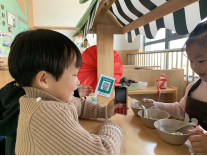 在班级区域游戏活动中,我们设立了小菜场和面馆,模仿着大家下馆子的步骤流程,体验生活的趣味;隔壁班级还有超市,我们也会进行联动游戏,进行模拟逛超市等生活情景模拟游戏;