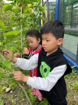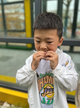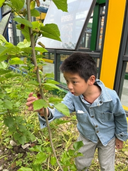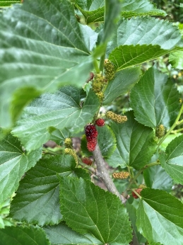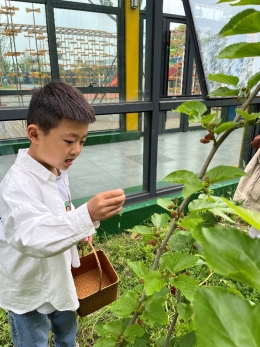 “快看,那绿绿的叶子间长出了紫色的果实!”孩子们在探索春天中发现了新的东西。一些孩子听到惊呼很快围到玻璃窗旁,趴着玻璃窗探头去寻找那些小小的紫色果实。“那有一颗,那也有一颗!”“还有绿色的!哇,快看,那边的树上也有!”“这是桑葚!可以吃的!我和妈妈去摘过,甜甜的。”……小朋友们七嘴八舌的讨论着,看着他们好奇心满满的样子,我决定带他们进到桑葚地里,更近距离的了解这些春天里的果实。