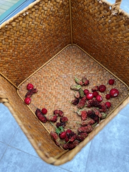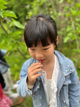 小朋友们拿着小竹篮,穿梭在桑葚地里,认真地寻找着枝叶间紫色的果实。不一会儿,紫色的桑葚就铺满了小竹篮,“哎,那些红红的果实是什么?可以吃吗?”有小朋友发现了藏在竹篮里红色果实,我看了看,告诉小朋友们那叫蛇莓,是蛇喜欢的小零食,人不可以吃哦。小朋友们听了连连点头,好奇地跑到蛇莓的植株旁观察。