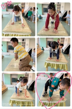 同样的器材玩久了就会厌,那么,掌握“一物多玩、物物结合”的理念,支持孩子们利用自己的创造力和想象力,参与场地布置、玩法考虑,并积极尝试,可以让幼儿得到更充分的发展。老师也应当鼓励幼儿自主挪动桌椅,摆出各种造型,促进幼儿钻、爬、跳、跨、走及平衡能力的发展。