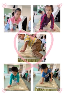 我们在游戏中加入了几张桌子,造成一个长隧道,就有了可以爬行的好地方,幼儿在爬行中也锻炼了他们的手脚并用的能力。