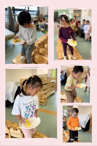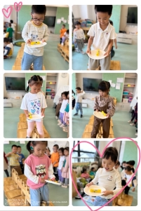 走和爬还有更多的锻炼方法哦!小朋友们手里端着盘子,盘子中间放了一个圆滚滚的双面胶,看看谁走的又稳又快吧!
