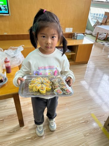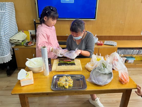 可口的寿司终于做好了!经过自己亲手做出来的食物是非常的的美味的,同时也希望孩子们可以珍惜粮食,知道“粒粒皆辛苦”这个道理。