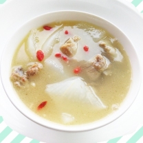 午餐:大米饭、红烧寸骨头、香干炒笋瓜、萝卜枸杞汤