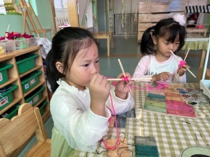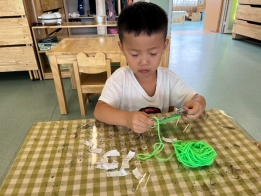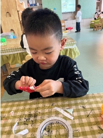 孩子们按照自己喜欢的形状裁剪了kt板,贴上双面胶,绕毛线活动开始了。