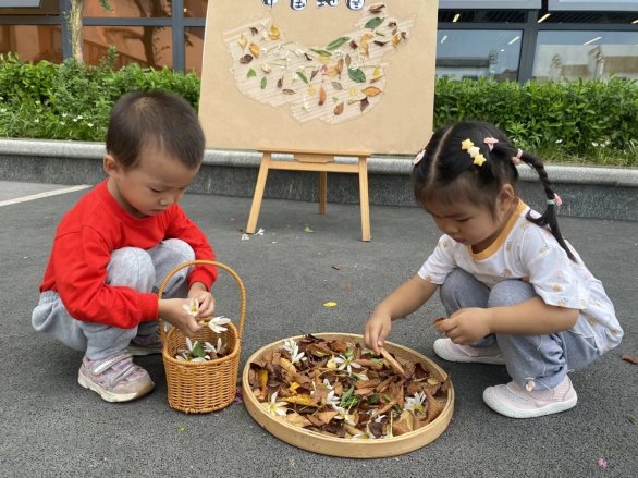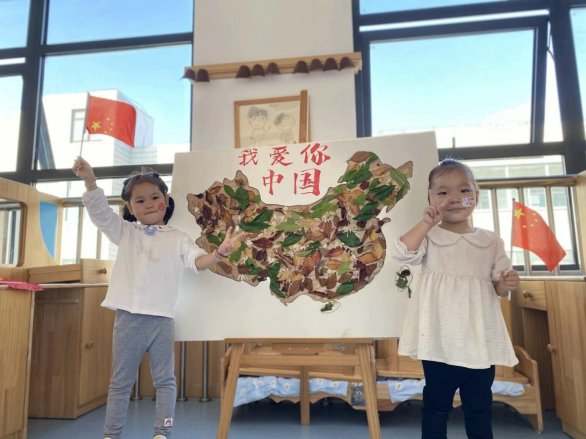 国庆手工与自然美育结合,小一班小朋友用落叶拼贴出生动有趣的中国地图,祝祖国繁荣昌盛。