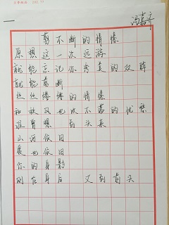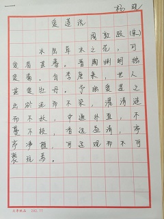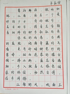 2.字体方面:书写正确、规范、美观。字体端正、匀称,大小适中。间架结构合理,行笔流畅,力度适中。
