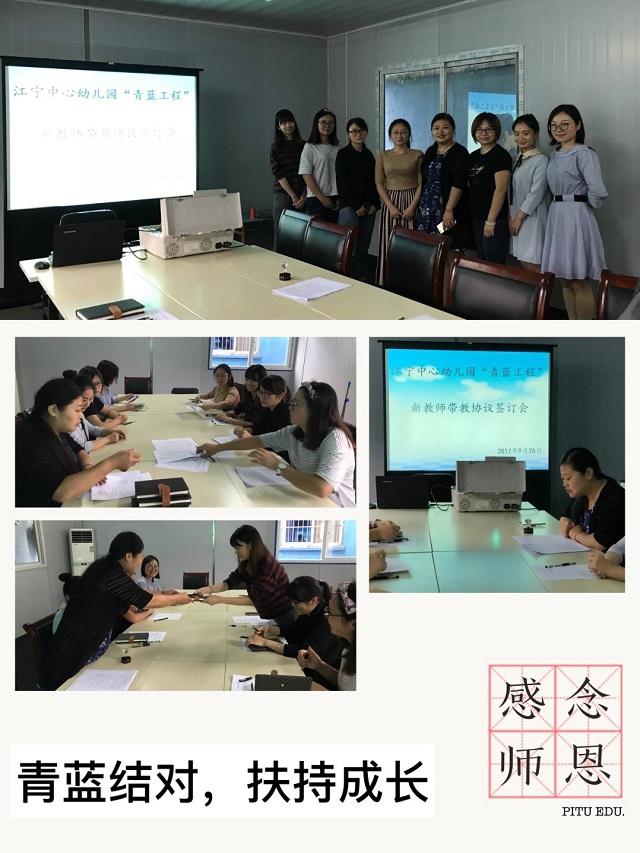 为充分发挥骨干教师的引领作用,加强对新教师的培养力度,使青年教师尽快成长,2017年9月27日,江宁中心幼儿园开展了青蓝结对协议签订会。幼儿园为每一位新教师推荐了优秀骨干教师作为他们的师傅,以指导、帮助他们尽快地实现角色的转换,快速提高教学业务水平和班级管理水平。