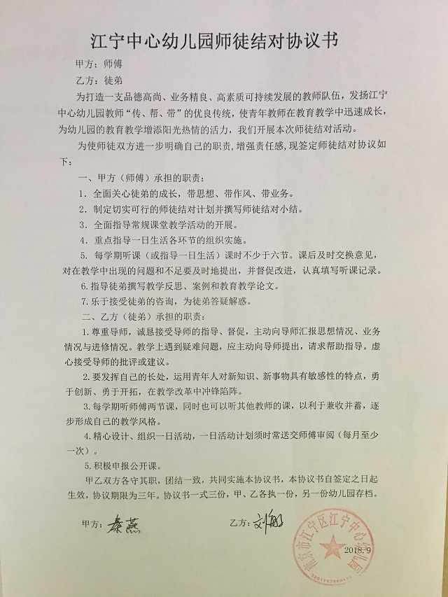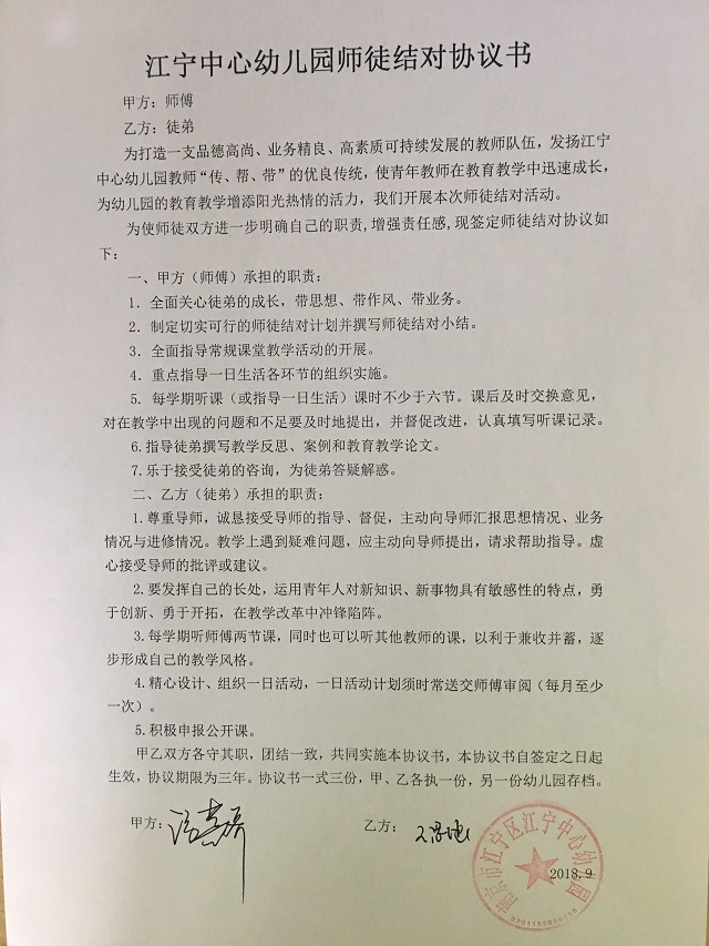 1.三年以下教龄的青年教师必须参加,根据自己的需要和特点,拜有经验的老师为师,要求园骨干教师须每人至少带教一个徒弟,师徒双方双向选择,开展拜师结对活动。
