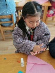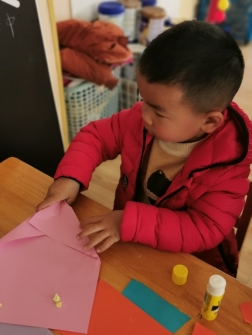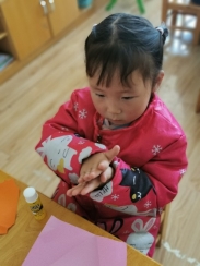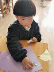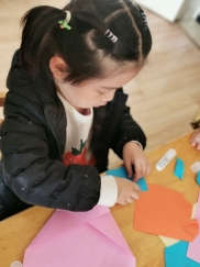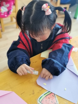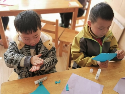 灵活的小手将纸片撕下来,在手中搓一搓、揉一揉,再小心地粘到底纸上。我们一起来看看他们用心制作好的礼物吧!